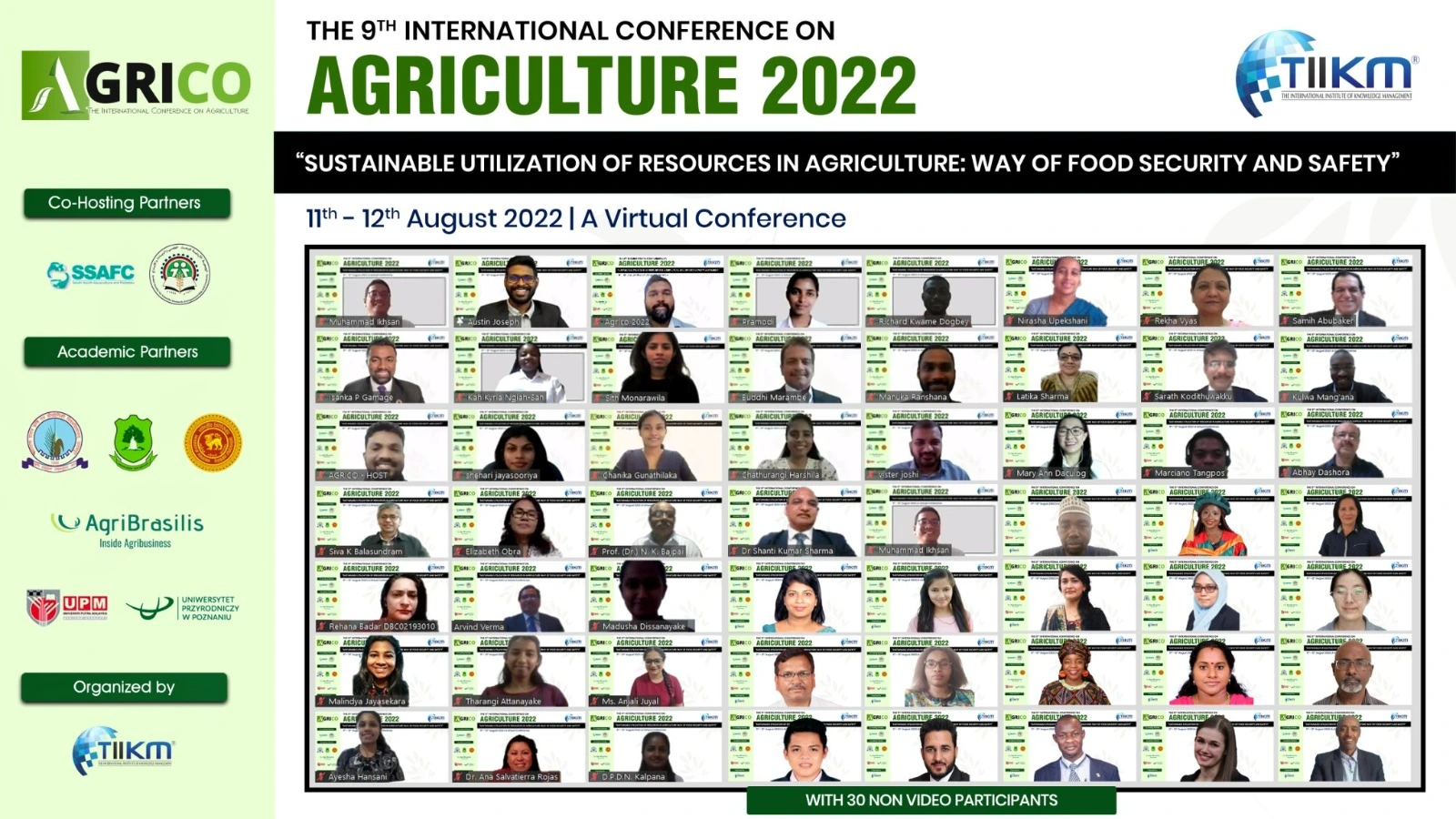 The 9th International Conference on Agriculture 2022 The was held on 11th – 12th August 2022 in Virtual Platform under the theme “Sustainable Utilization of Resources in Agriculture: Way of Food Security and Safety”. The conference was organized by The International Institute of Knowledge Management (TIIKM), Sri Lanka.