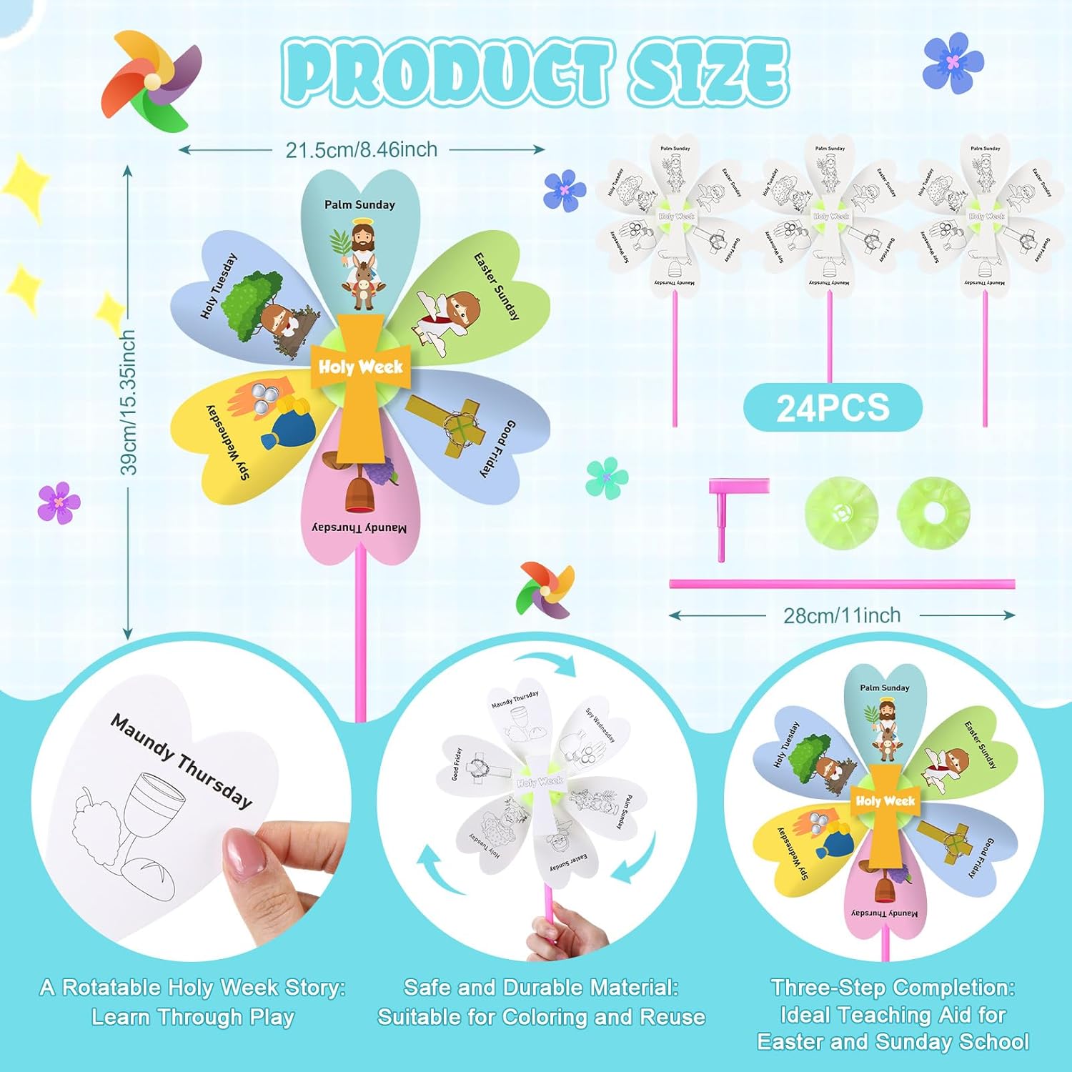Features: These craft kits promote creativity and create really fun novelty gifts, collectibles, rewards and goodie bag parties, perfect for any themed birthday fillers, Easter gifts, religious, Sunday school, also great for school assignments, craft group activities and more The Religious Easter crafts engage them in craft-making and serve as splendid Easter season decorations at your home. Whether it is to celebrate Easter or decorate Sunday school parties, our products add a festive touch to any setting. Specifications: Material: PP Color: white Size: about 8.46 x 15.35 inch Package includes: 24 x Easter pinwheels with assembly guide Notes: Manual measurement, please allow slight errors on size. The color may exist a slight difference due to different screen displays Small parts included, please keep them away from little kids to avoid swallowing risk