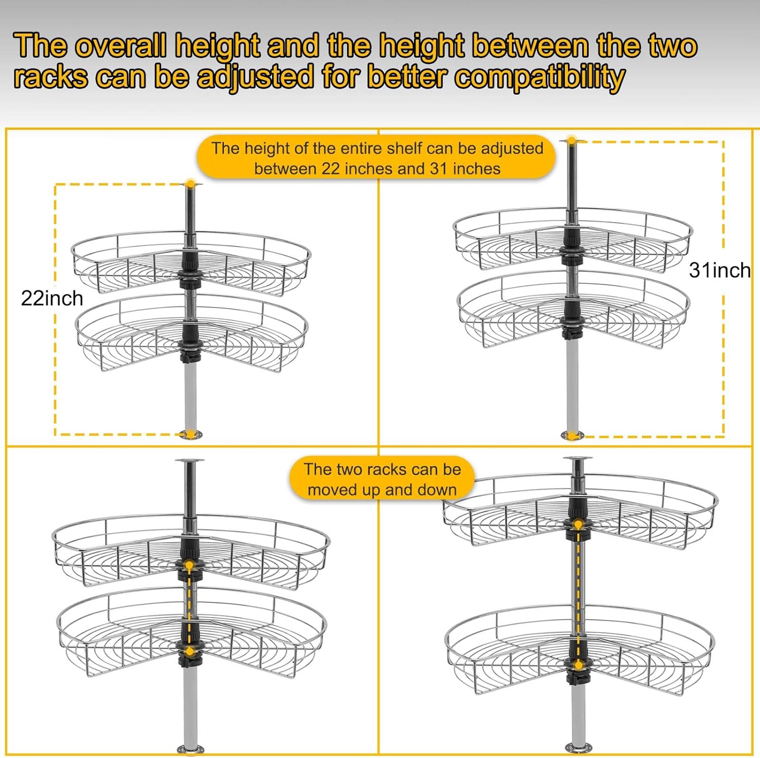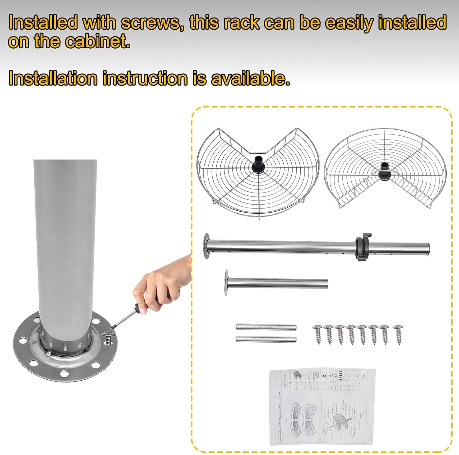 Details Rounded Corners: The rounded edges are smooth, which is comfortable to touch and enhances safety during use.Round Installation Base: It ensures that the product is mounted more securely in the cabinet.Application It can be used in kitchens, bathrooms, bedrooms, living roomsCan hold spice jars, toiletries, vegetables, snacks, groceries, corn, potatoes, onions, and moreSpecification Material: IronProcess: ElectroplatedColor: SilverAssembly Required: YesMounting Type: Cabinet MountedNumber of Tiers: 2Rotation: 360°Each Tier Load Capacity: 5-7 kg / 11.02-15.43 lbsAdjustable Height: 56-79 cm / 22-31 inEach Baffle Height: 7.5 cm / 3 inProduct Size (D×H): 60×79 cm / 23.62×31 inPackage Size: 62×52×18 cm / 24.41×20.47×7.09 inGross Weight: 5 kg / 11 lbsNet Weight: 4.5 kg / 9.9 lbsPackage Included 1 × Rotating Kitchen Shelf1 × English Installation DiagramOther Accessories for UseNotes Please note that this product does not include other items.Please choose the right size before buying.