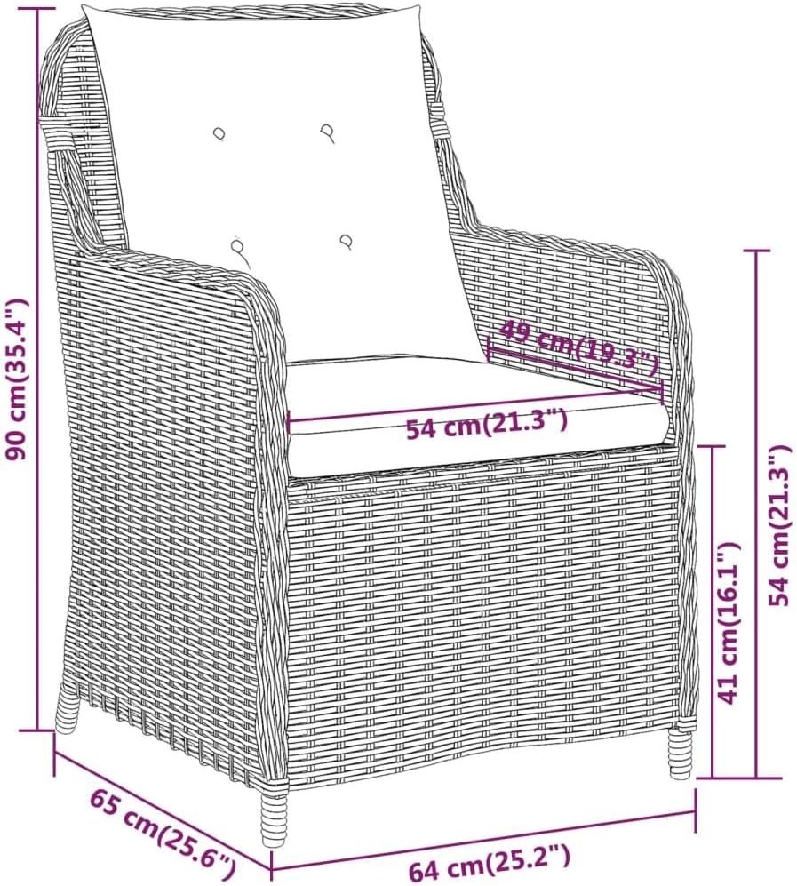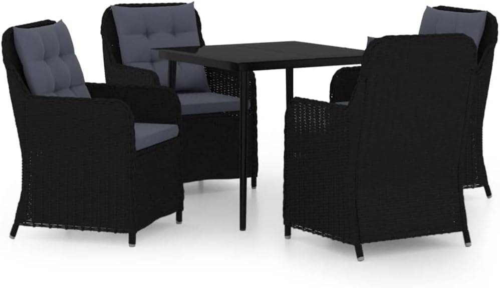 Enjoy a nice meal or afternoon tea in your outdoor space with this patio dining set! Featuring an elegant design, it will become the focal point of your garden and patio!The practical outdoor dining set has a steel frame, making it strong and sturdy. The garden chairs are made of water-resistant and maintenance-free PE rattan, making them perfect for outdoor use. The ergonomically-designed shape and thickly-padded, removable cushions with foam filling will provide the ultimate seating comfort. The low-maintenance polyester cushion and pillow covers can be easily removed and washed. In addition, the smooth glass tabletop is easy to clean with a damp cloth and excellent for placing meals, drinks and other decorative items.Note: In order to extend the life of your outdoor furniture, we recommend you to clean it regularly and do not leave it outdoors without protection unnecessarily.Clean: Use a mild soap solution.Storing: If possible, store in a cool, dry place indoors. If the product is stored outdoors, protect it with a waterproof cover. Wipe and dry the excess water or snow from flat surfaces after a rain or snowfall. Allow sufficient air circulation to avoid moisture-related damage.TableColor: BlackMaterial: Powder-coated steel, glassDimensions: 31.5" x 31.5" x 29.1" (L x W x H)Chair:Chair color: BlackCushion color: Dark grayChair material: PE rattan, powder-coated steelCushion material: 100% polyesterChair dimensions: 25.2" x 25.6" x 35.4" (W x D x H)Seat width: 21.3"Seat depth: 19.3"Seat height from the ground without cushion: 16.1"Armrest height from the ground: 21.3"Weather-resistantAssembly required: YesDelivery contains:1 x Table4 x Chair4 x Seat cushion4 x Back cushion