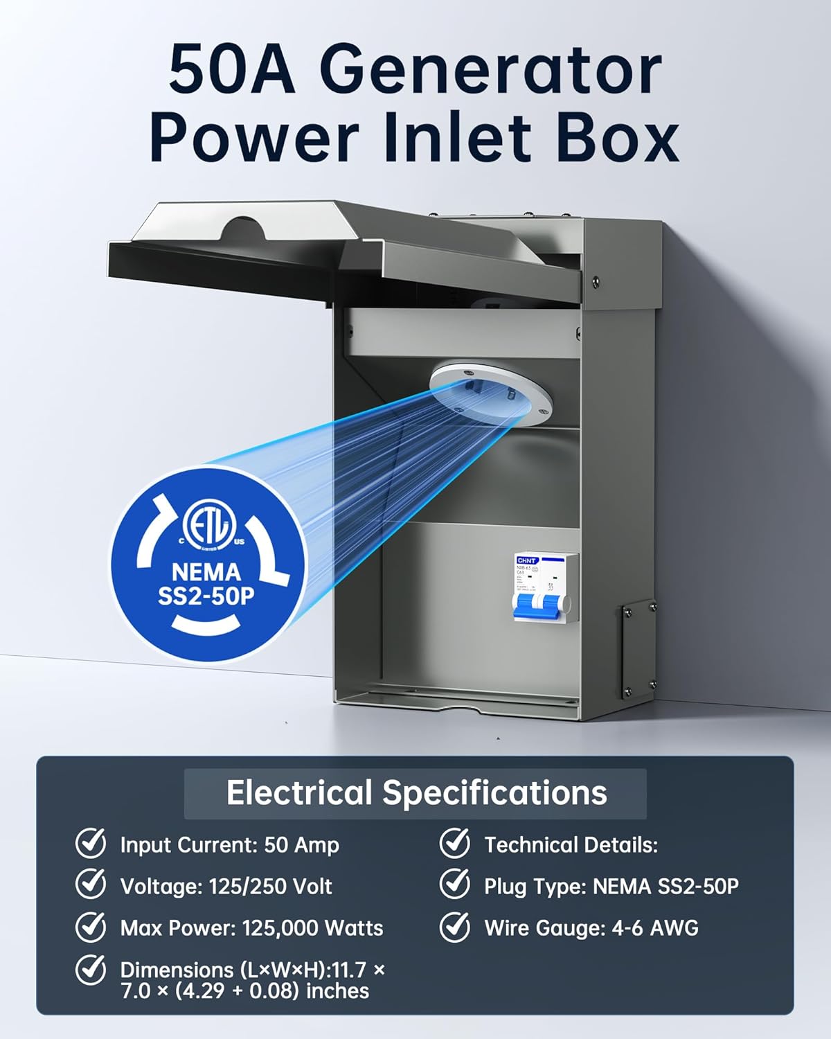 | Included Components | 50 Amp Generator Inlet Box with Circuit Breaker |