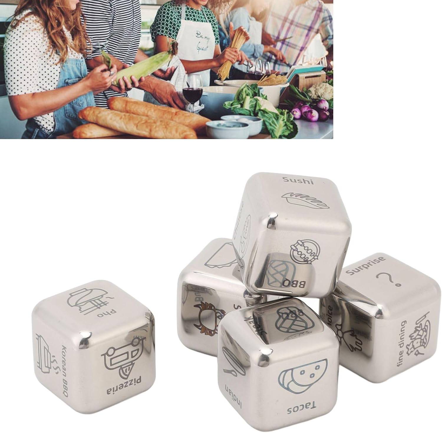 Item Type: Food Decision DiceMaterial: MetalSize: Approx. 2.5 x 2.5cm / 0.98 x 0.98inPackage List:5 x DiceNote:Warm Tip: Children should play under adult supervision to avoid swallowing small toy parts.