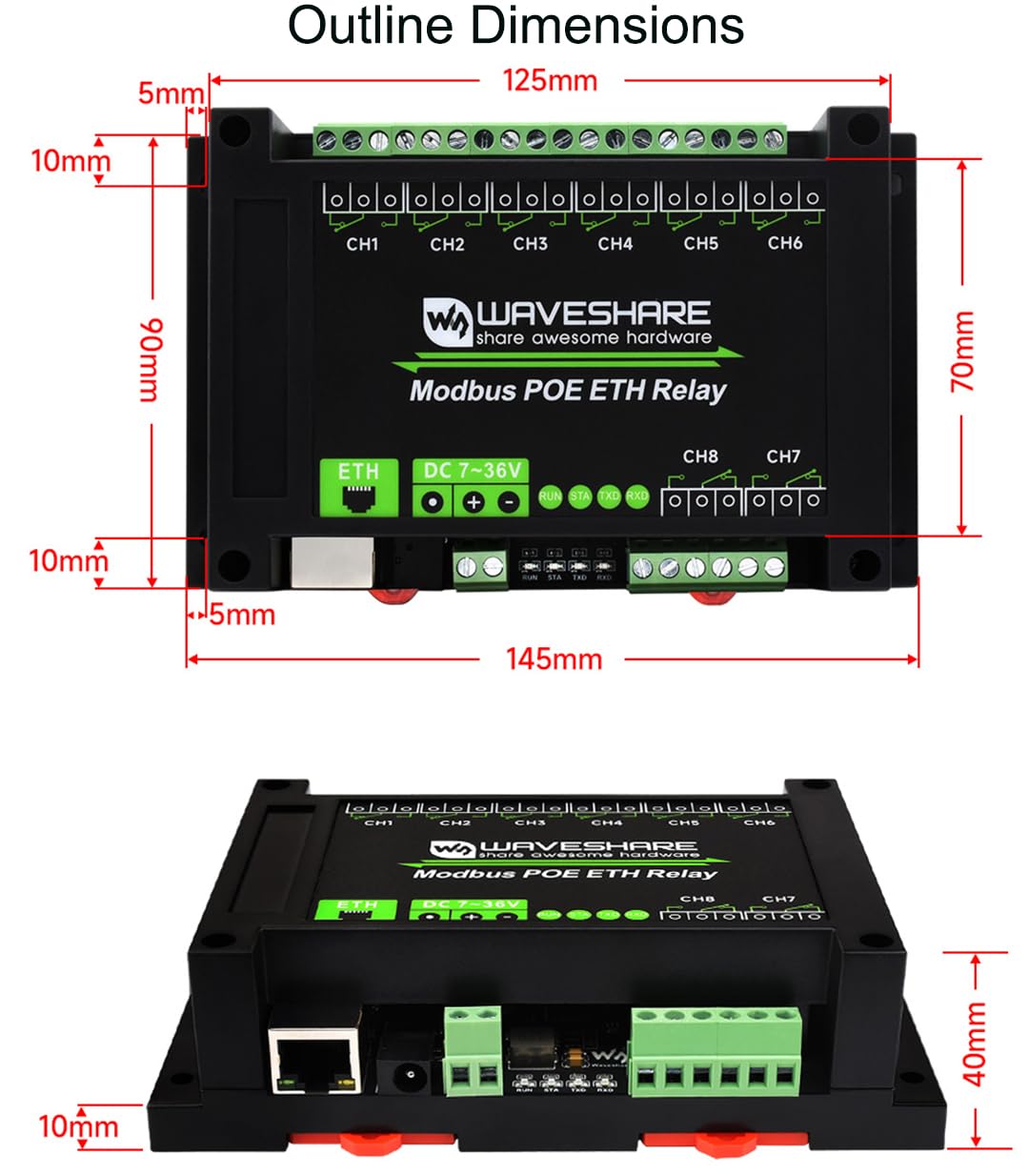 Overview This product is an industrial 8-ch relay module controlled via Ethernet port, adopts Modbus RTU/Modbus TCP protocols, supports PoE power supply, also comes with an ABS rail-mount case. Features 1. Supports sending Modbus RTU/TCP protocol commands via Ethernet port to control relay and various devices 2. Supports Multiple Communication Modes, Adopts Modbus Protocol --Supports TCP Server / TCP Client / UDP Mode / UDP Multicast / HTTP / MQTT --Supports Modbus RTU protocol/Modbus TCP protocol 3. Multi Configuration Methods Supports software and Web Browser Configuration, Obtaining Dynamic IP Via DHCP, connecting to domain name server via DNS protocol 4. Multi Power Supply Options, Wide Range Power Input --DC Power port: directly uses a power plug for power supply; --Screw terminal: DC 7~36V wide range power input; PoE port: IEEE 802.3af PoE compliant 5. Relay Connection --Contact Rating Of The Onboard Relay Up To 10A 250VAC/30VDC --Directly Controlling 220VAC Home Appliances, Or Devices Below 30VDC 6. 4 LEDs and Network indicators for indicating the MCU status and signal transceiving status --RUN: Ethernet port indicator, blinking in 2-second cycles when Ethernet port normally working --STA: MCU indicator, blinking when the MCU normally working --TXD: TX indicator, lights up when sending data --RXD: RX indicator, lights up when receiving data 7. Application Scenarios --Control the on/off operation of household devices such as air conditioners, routers, lighting, computers, and door curtain motors, etc. --Control the on/off operation of agricultural equipments such as solenoid valves, motors, water pumps, etc. How-to-use document/User Manual ://bit.ly/45dleiL Package Content Modbus POE ETH Relay x1