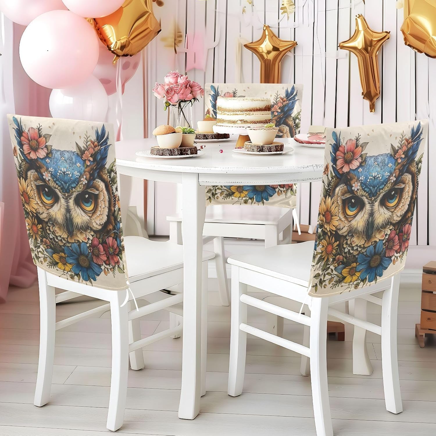 Chair Cover Material made of polyester,comfortable and soft to touch,reusable and suitable for long term use Features easy to install and remove, tie rope design at the bottom,machine washable Stylish Chair Decoration With beautiful pattern,it can be used for family party/ birthday party/wedding/ holiday party to add atmosphere, also can be used for chair decoration in living room, dorm, kitchen dining room,bedroom to bring protection to the chair while avoiding stains to dirty the chair back. Easy To Care Machine washable, Not washing with hot water, Not bleaching