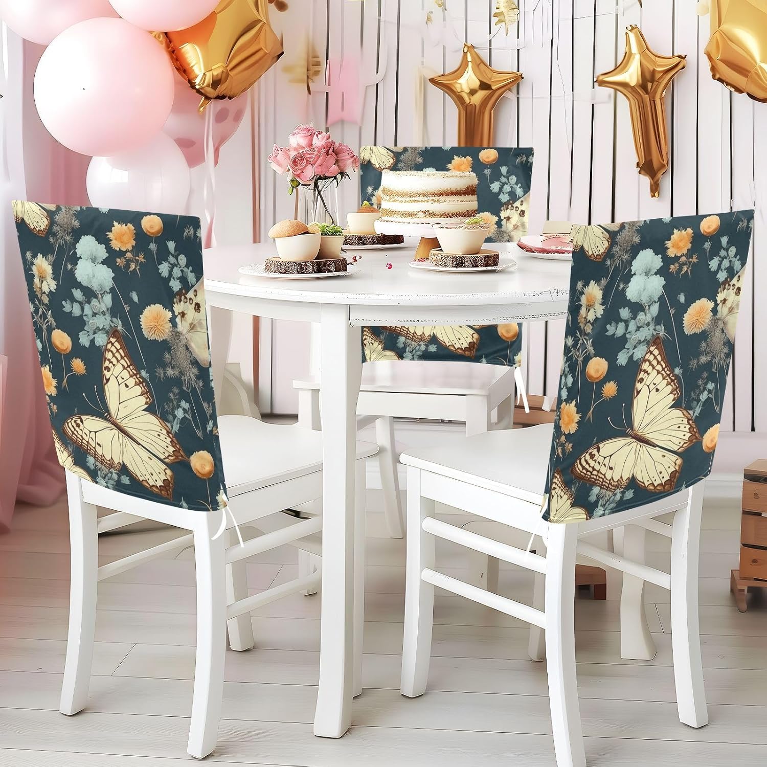 Chair Cover Material made of polyester,comfortable and soft to touch,reusable and suitable for long term use Features easy to install and remove, tie rope design at the bottom,machine washable Stylish Chair Decoration With beautiful pattern,it can be used for family party/ birthday party/wedding/ holiday party to add atmosphere, also can be used for chair decoration in living room, dorm, kitchen dining room,bedroom to bring protection to the chair while avoiding stains to dirty the chair back. Easy To Care Machine washable, Not washing with hot water, Not bleaching