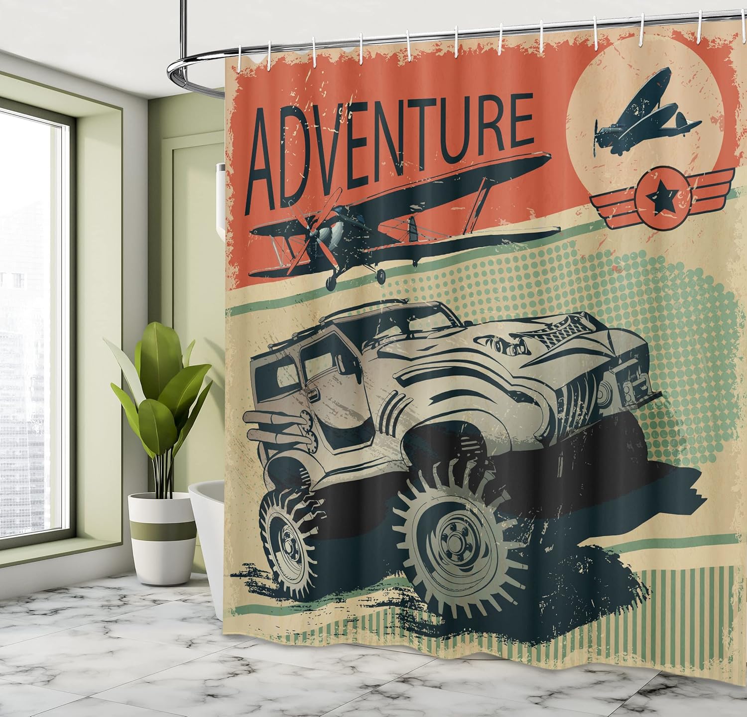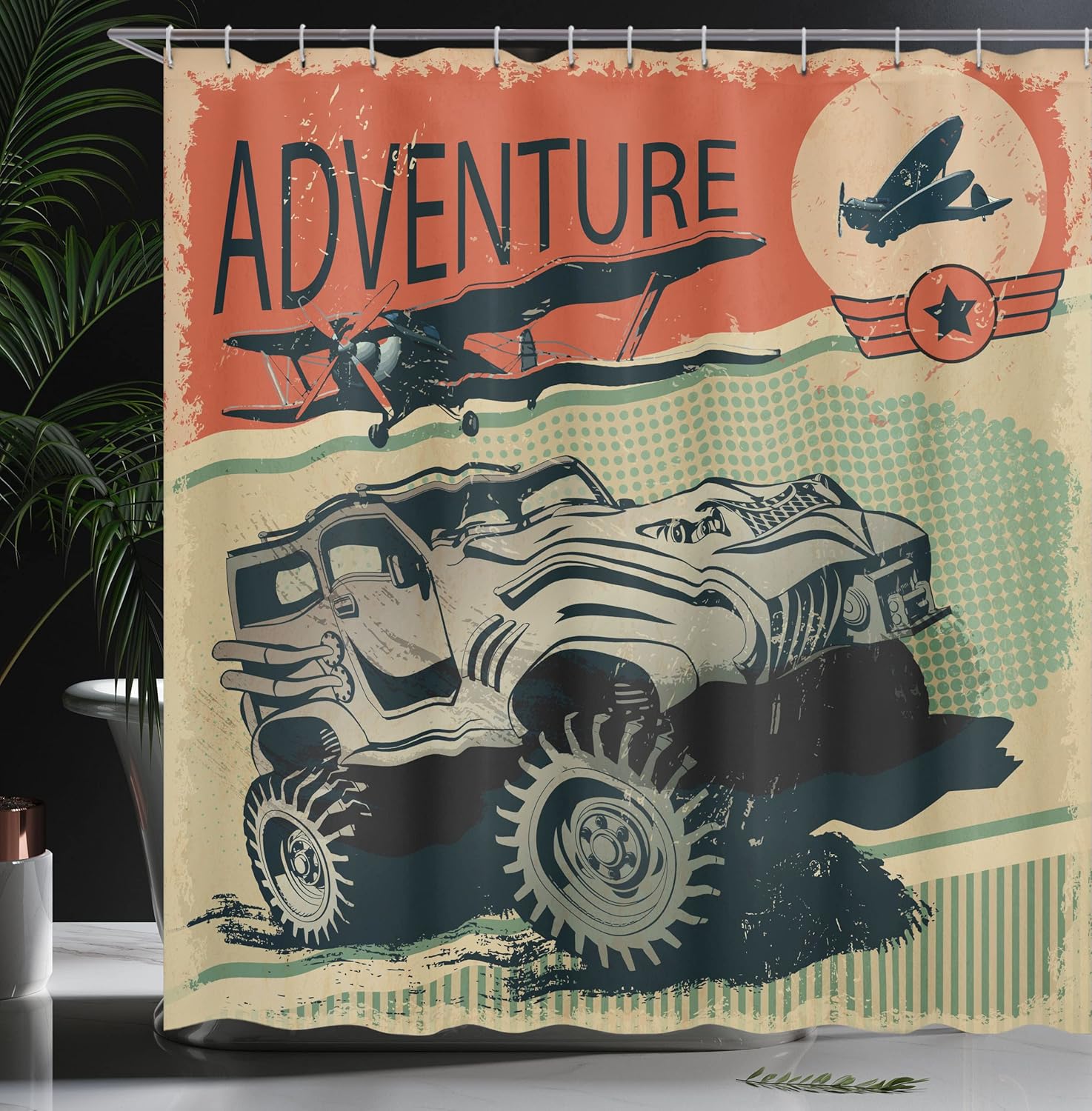 Ambesonne Adventure Shower Curtain, Aged Damaged Display with Retro Elements Strong Vehicle and Airplanes Print, Cloth Fabric Bathroom Decor Set with Hooks, 69" W x 84" L, Tan Orange Green