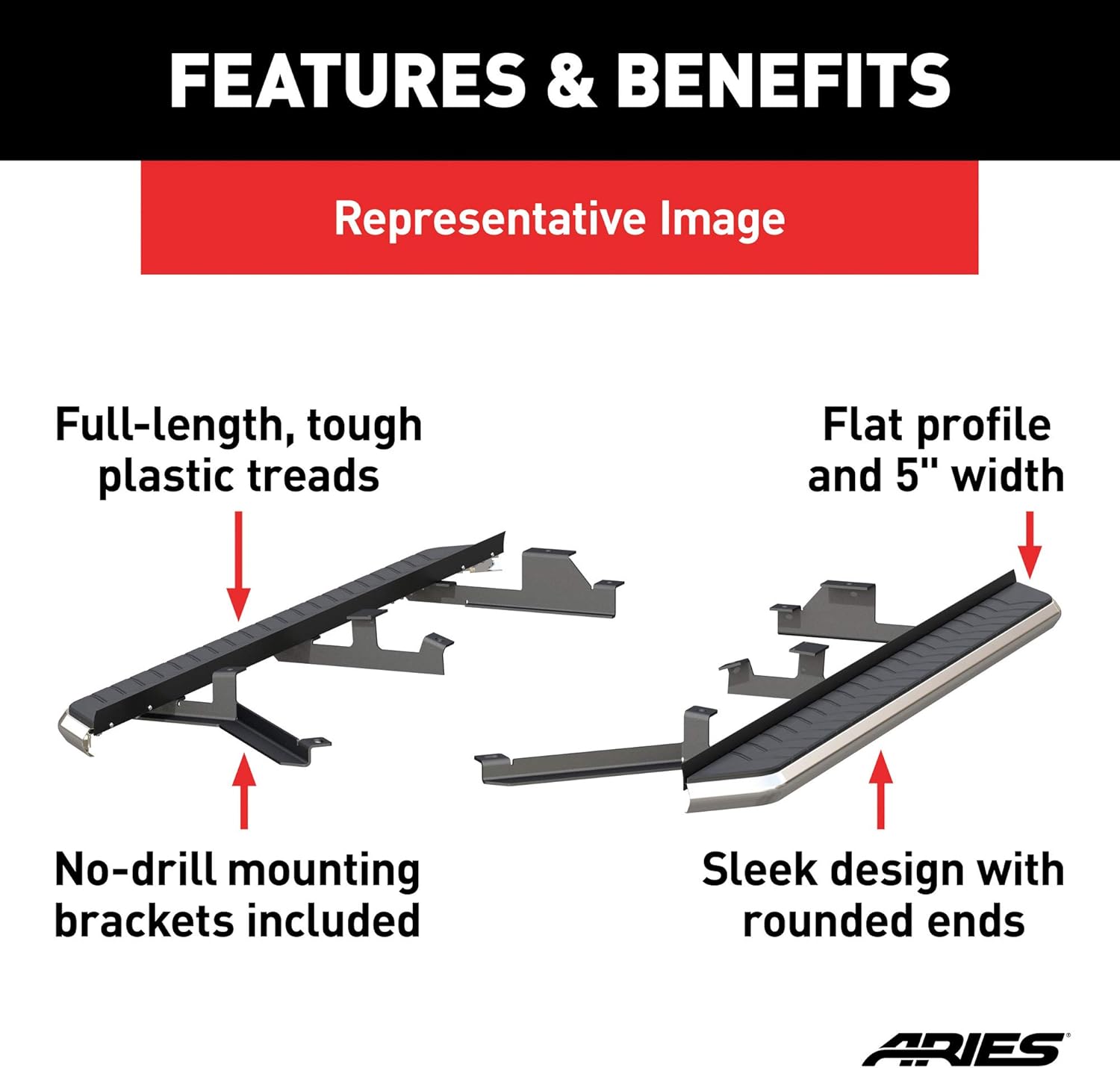 For some, it's more than just a drive. It's about definition -- finding the rush that comes with your hands on the wheel and your foot on the gas -- and it starts by stepping into your vehicle with confidence. ARIES AeroTread running boards give new definition to your drive with their sleek design, full-length treads and flawless finish. They feature unencumbered aluminum construction and a custom contour to redefine your look and offer a solid step up. Made specifically for today's crossover and SUV, ARIES AeroTread running boards are marked for their aerodynamic look and lightweight build. They are constructed from an extruded aluminum base, making them strong and impervious to the elements. Each set of running boards features sleek, curved edges with tapered ends to seamlessly blend with the body of your vehicle. To give you the exact, customized look you want, AeroTread running boards come with one of two front-trim finish options: polished stainless steel or black carbide powder-coated stainless steel. They are also equipped with a 5" wide, hard plastic step pad that runs the entire length of the board, providing a non-skid surface no matter where you place your foot. AeroTread running boards install using a track mounting system to attach vehicle-specific brackets, and pre-existing holes in the vehicle's frame are used to eliminate drilling, speed up installation and ensure stable footing. This set of running boards is designed to fit specific years of the Chevrolet Blazer (see application information to verify compatibility with your vehicle). The mounting brackets are made from steel and are coated in a powder coat finish for long-lasting dependability. Whatever road you choose, define your drive with ARIES AeroTread running boards.