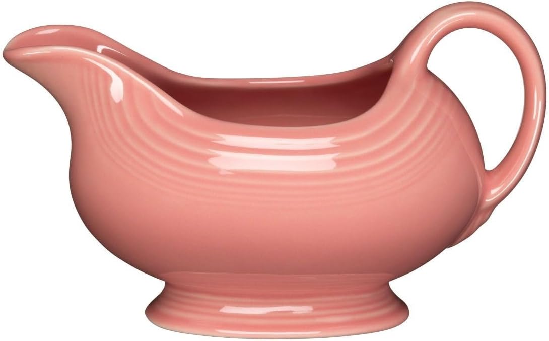 Product Description Fiesta 18-1/2-Ounce Sauceboat manufactured by The Homer Laughlin China Company. America's largest domestic producer of dinnerware, and the sole manufacturer of all Fiesta dinnerware. All Fiesta pieces are Microwave safe, Oven-proof, Dishwasher safe, Freezer proof, Lead-Free, and Made in America with the implementation of many green practices. The very durable glaze is great for everyday use. Fiesta as a pattern has stood the test of time, and is typically passed down from one generation to the next. We have kept the pattern constant through the years so that you can count on us to be here when you decide to expand or change your collection. New pieces and colors are added every so often to keep things interesting. Currently, Fiesta is the most collected dinnerware in America. Amazon.com First manufactured in 1936 during Art Deco's later, less ornate phase, Fiestaware went out of production in the 1970s but returned in the 1980s and now enjoys unprecedented popularity. Older pieces fetch hundreds or even thousands of dollars at auction. The new line offers the original designs in contemporary colors at affordable prices. To complete a set of turquoise Fiestaware or complement your collection of multicolored Fiestaware, this curvaceous sauceboat is essential. Made of vitrified china with a gleaming, lead-free glaze, the sauceboat holds 12 to 14 ounces, measures 8 inches from spout to handle, and is both dishwasher- and microwave-safe. --Fred Brack