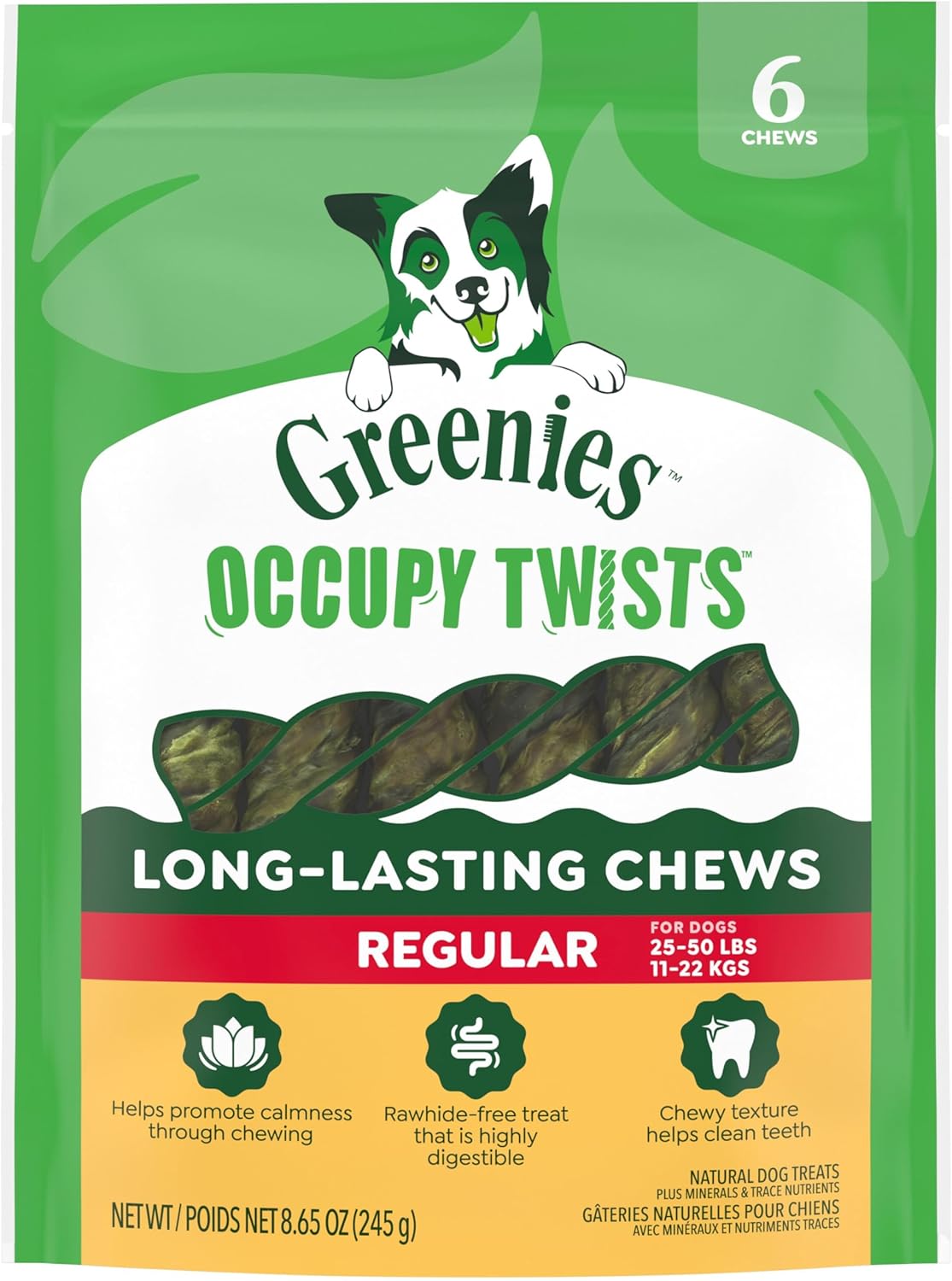 Whether your dog needs a treat or something to keep them occupied, Greenies Occupy Twists All Natural Dog Treats can help your furry friend feel engaged and relaxed as they chew. These rawhide-free dog chews long-lasting pet treats are made with natural ingredients plus minerals and trace nutrients. The dog chews are crafted into a twist shape and help promote calm behavior through chewing, making this a great choice for dogs who need a little relaxation. These dog dental chew sticks are formulated without fillers or artificial flavors. The easy-to-digest formula is made with real chicken, so you can feel confident giving these chewy treats for dogs twice per week, and your furry friend will enjoy the tail-wagging flavor. Plus, Greenies Occupy Twists chicken dog treats reduce plaque build-up, so you can incorporate them into their regular dog teeth cleaning routine for dental hygiene and dental care. Whether dog owners are looking for a way to keep your dog occupied or just want to give them a tasty teeth-cleaning reward, Greenies Occupy Twists Natural Long Lasting Dog Treats Chicken Flavor are the mouth-wowing treat you're looking for. Make Health A Treat!