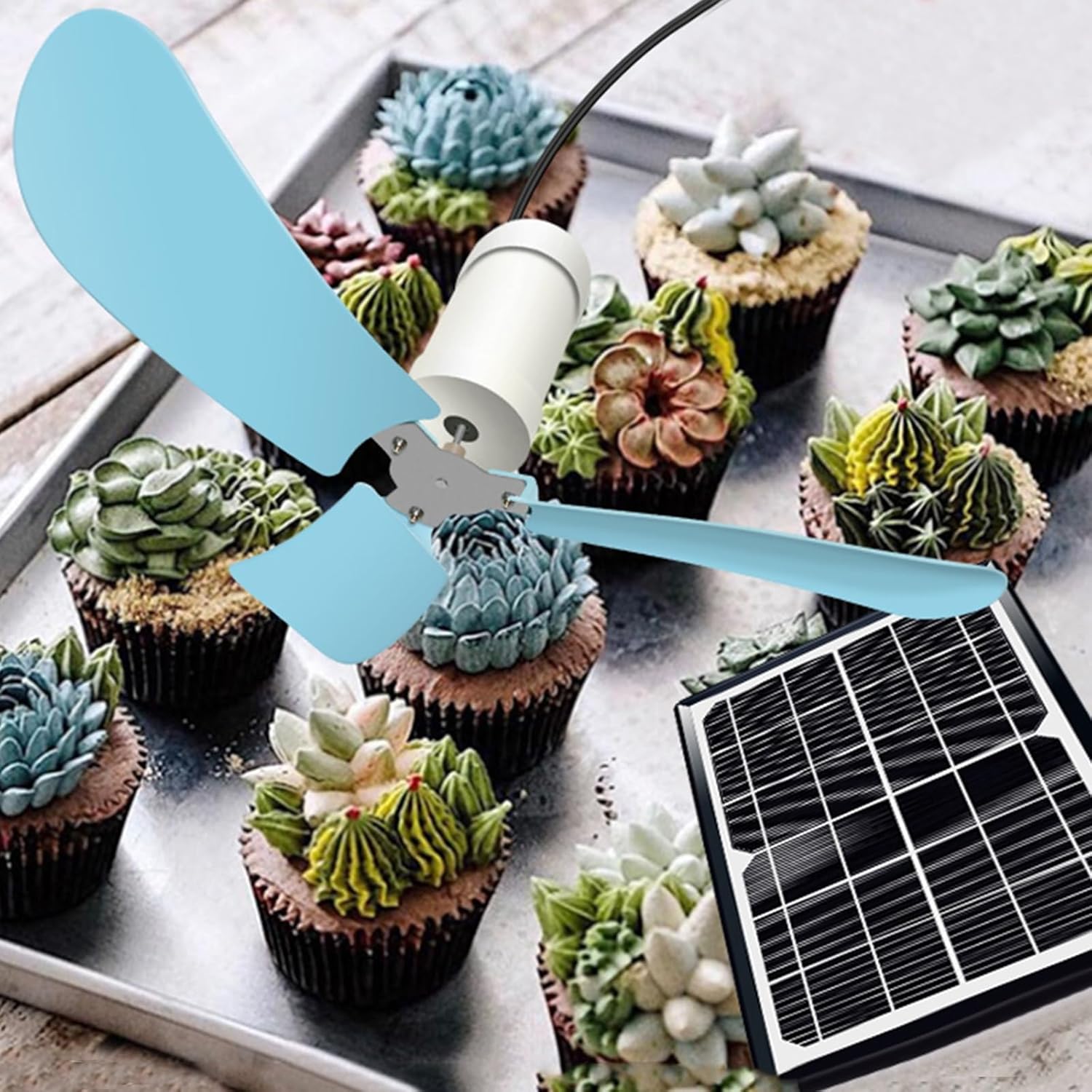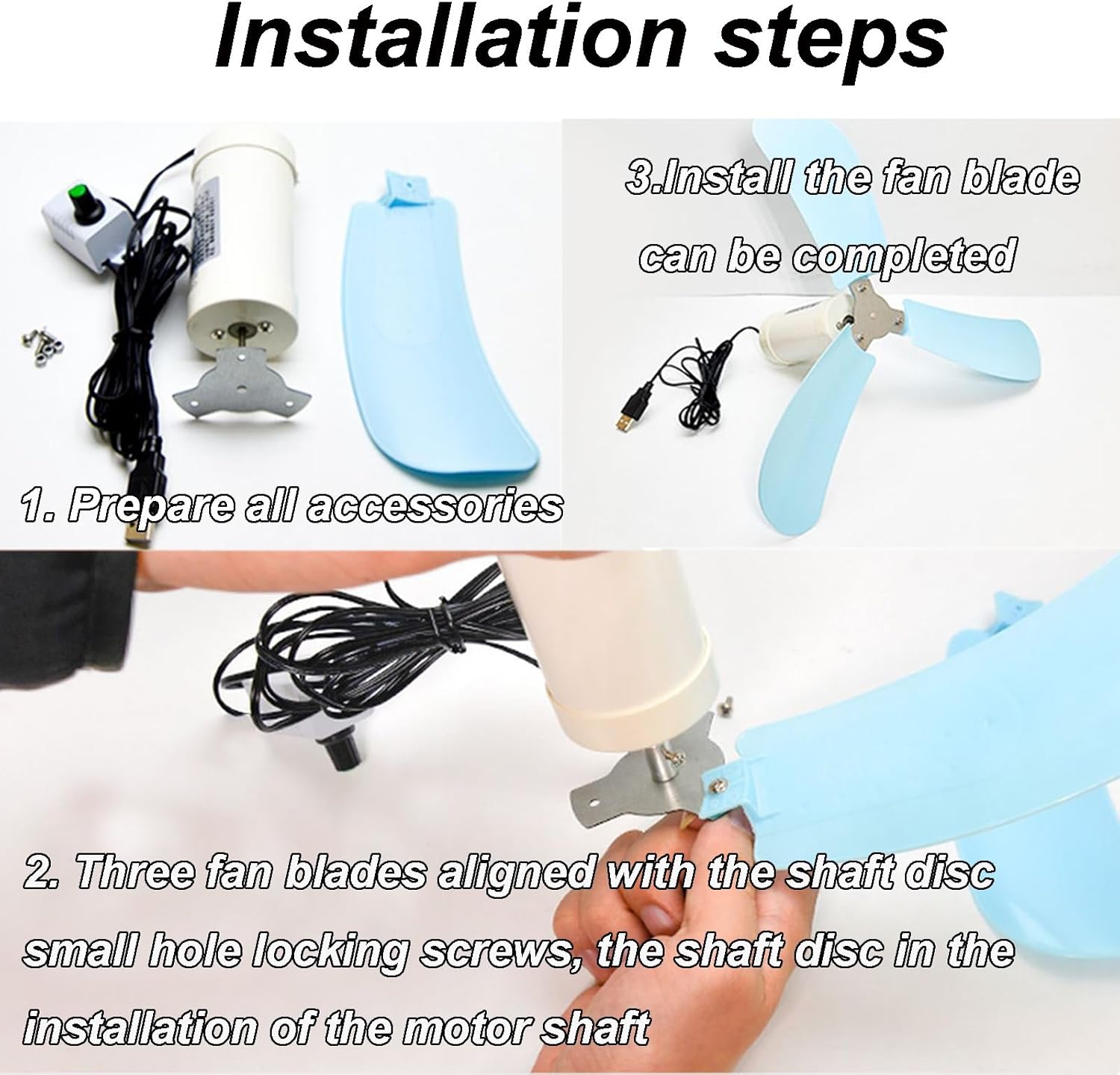 Pure copper motor, adopts high efficiency and power saving, pure copper coil motor.Rounded edge processing, fan blades with rounded edge processing, accidentally touched will not be injuredProduct name:blue ceiling fanProduct power: 5WInstallation: hanging/hook<;450 rpmProduct size: motor: 5.5 * 10centimetre; single fan blades: 17centimetre; installed diameter 40centimetreProduct list: fan x1, solar panel x1, power cord x1Attention Tip:There should not be any protection in front of the solar panel during operationsPlease do not touch the fan blades when the ceiling fan is rotating at high speed, be careful of injuriesThis product is compatible with mobile power and mobile phone chargers, if it does not work properly, please replace the other mobile power and mobile phone chargers