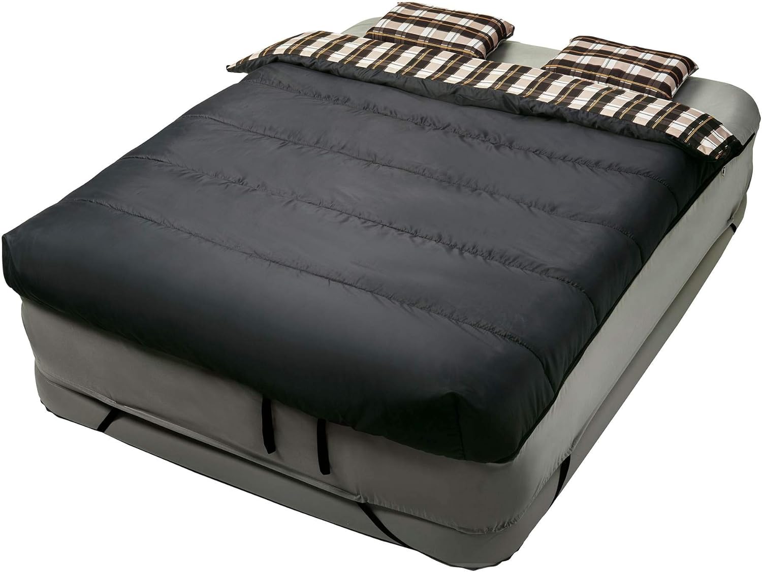 Next time you camp out for the night or have to crash on someone's air mattress, you'll feel as comfortable as if you were sleeping in your own bed. The Insta-Bed 6-piece bedding has everything you need to make any queen-sized air mattress feel like home. The set includes a fitted sheet, a comforter, 2 inflatable pillows, and 2 pillowcases. (Set does not include an airbed mattress. ) the comforter also converts into a sleeping bag, perfect for camping. The comforter and fitted sheet zip together, so they won't slide off the bed with you on them! The set fits single high and raised Queen airbeds.