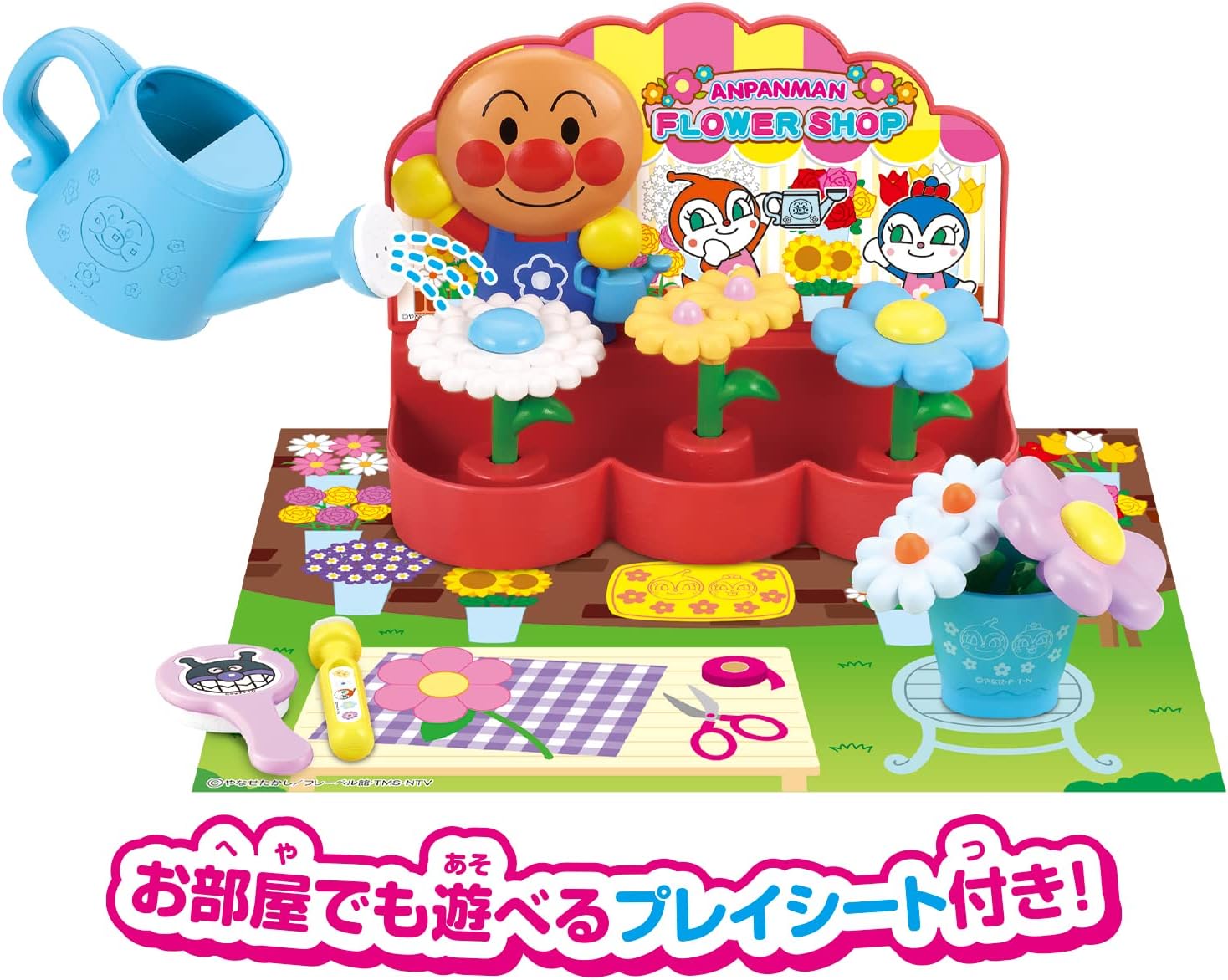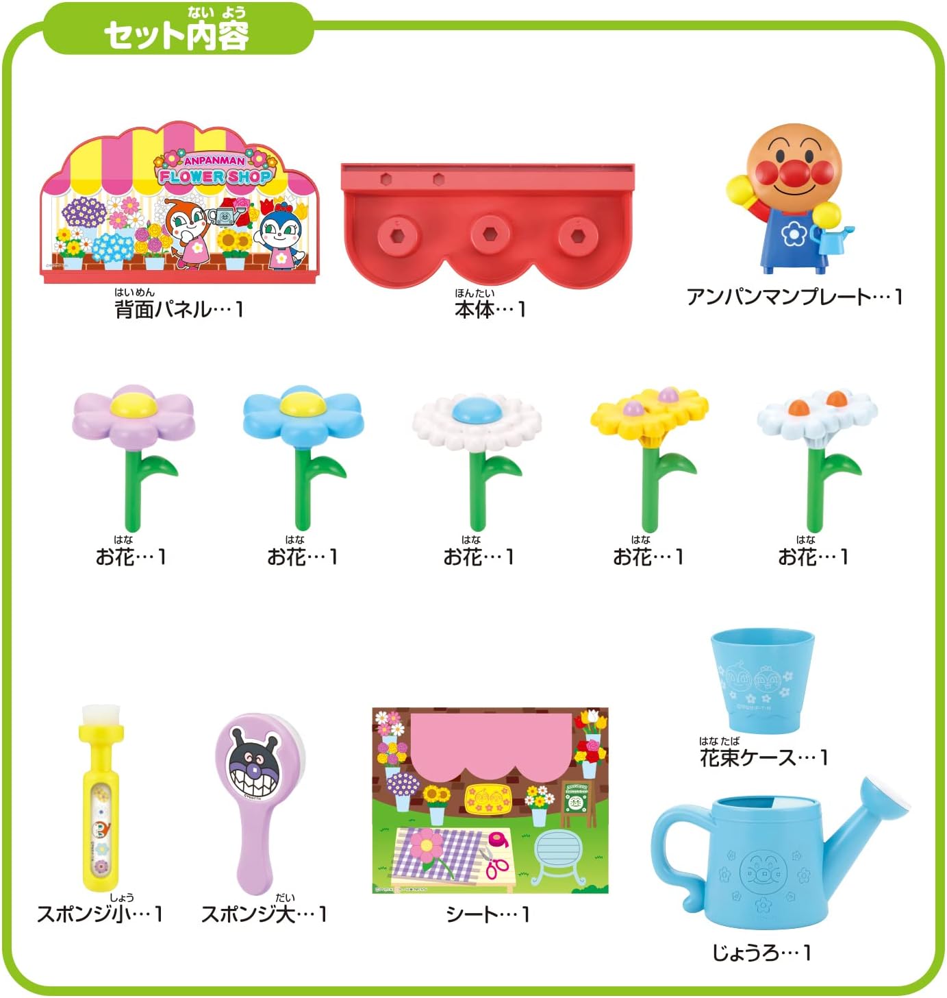 [Set Contents] Main unit: 1 Back panel: 1 Anpanman plate 1. Flowers: 5 Watering can: 1 Bouquet case 1 Sponge (small/large): 2 Sheet : 1 (All other than those included with this product are sold separately. ) Recommended Age: 3 years and up.