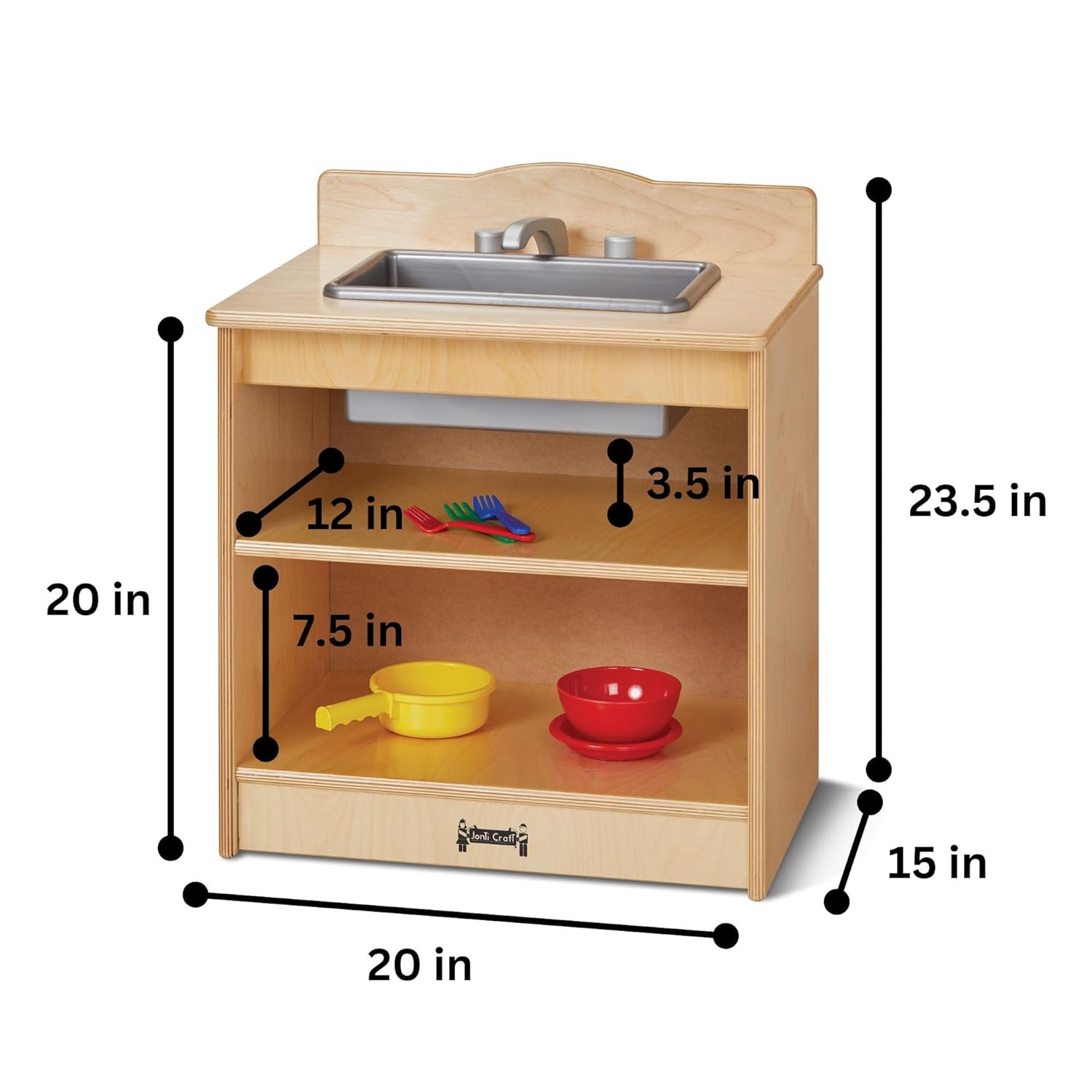 Encourage toddlers to engage and interact with imaginative, hands-on play using our play kitchen sink. The Toddler Kitchen Sink features turn-button controls, swivel faucet, and open shelving for storing dishes, play food, toys, and more. This pretend sink allows children to interact and use their imagination in a variety of settings. Perfect for your classroom, daycare, preschool, home, montessori, and more. The wooden Toddler Kitchen Sink is 23.5" high x 20" wide x 15" deep, and weighs 28 lbs. Designed especially for toddlers, the counter is 20" high. Play food and dishes not included.