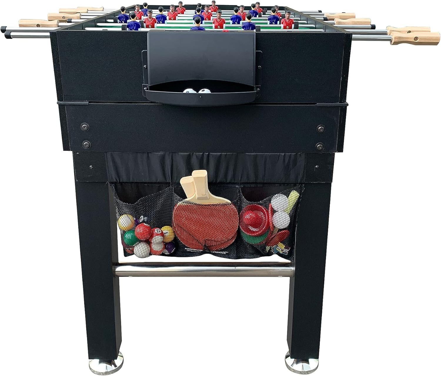 About the KICK Quad 48" 4-in-1 Multi Game TableThe KICK Quad 48" 4-in-1 Multi Game Table is a versatile and space-saving gaming center that offers four thrilling games in one. Enjoy exciting matches of air hockey, foosball, pool, and ping pong, all in a single table. Its sturdy construction and stylish design make it a perfect addition to any game room or family entertainment space. Get ready for endless hours of fun with friends and family with the KICK Quad 48" Multi Game Table, catering to players of all ages and skill levels.Technical Specifications:-Table Weight: 78 Lbs-Premium Bearings-1/2 inch Thick Playing Field-Sturdy 3.5-inch Leg Levelers -Convenient Front Ball Return on Each End of Table-Slide Scoring Mounted On Each End of Table-1-Goalie or 3-Goalie Design (Player Preference)-8 Durable 1/2 inch Semi-Solid Stainless Steel Chrome-plated Player Rods-13 Red and 13 Blue Uniformed Men-2 Soccer style Balls-1-table tennis net, 2-metal table tennis post, 2-table tennis paddles, 2-table tennis balls-Lifetime Warranty (Only on New Tables Purchased From KICK)-2 hockey pushers (72mm), 2 - pucks (60mm) -1 - table tennis net, 2 - metal table tennis post, 2 table tennis paddles, 2 table tennis balls-Free Rod Lubricant (Upon Request & Shipped Separately, Contact KICK with your shipping address)Your 100% satisfaction is our #1 priority. If there is anything we can do to improve your experience or if you have any questions, concerns, or are not 100% satisfied please call KICK Foosball now & we will do everything to make it right. Remember all KICK tables have a LIFETIME warranty on all parts, so rest assured you’re covered!