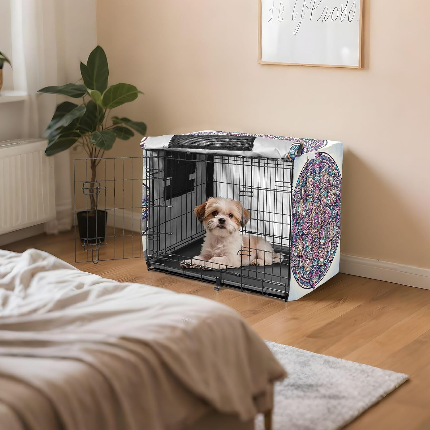 Protection – Made from 600D silver-coated oxford fabric, this dog crate cover provides reliable protection against weather conditions, including wind and rain. It prevents your dog from scratching the crate and blocks harmful UV rays.Easy Installation – This indoor pet crate cover features a user-friendly fastening system, allowing for quick installation without tools. It securely attaches to your dog crate, ensuring it stays in place for continuous protection.Effective Ventilation – Mesh windows on every side of the crate cover allow for steady airflow, keeping your dog comfortable and well-ventilated while inside. This design ensures your pet has a cool and breathable environment.Secure Fit – Equipped with four tie-down straps, the cover stays firmly in place, preventing it from shifting or being blown away. This added stability makes it suitable for outdoor use even in windy conditions.Ideal for Multiple Uses – This versatile dog cage cover is Suitable for both indoor and travel use. Whether you’re at home, on a road trip, or camping, it offers a practical solution for protecting your pet’s crate.