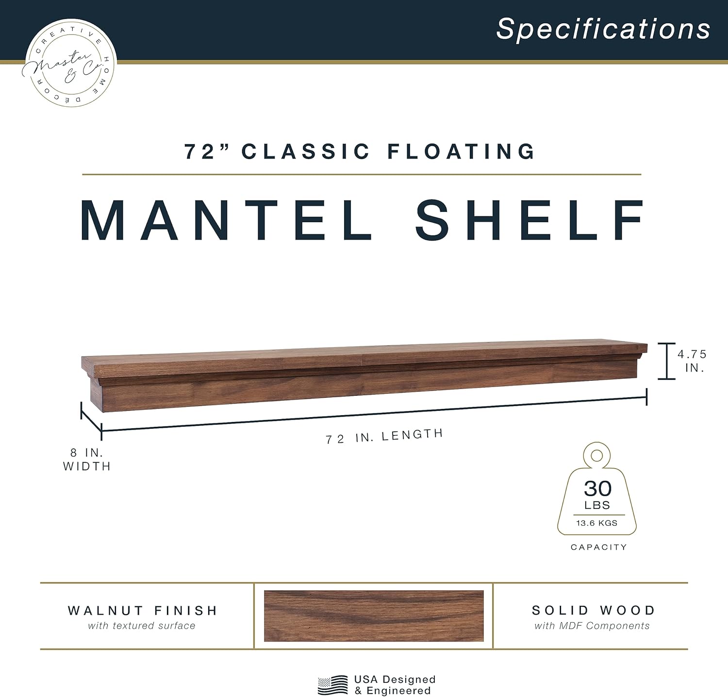 The Classic Master and Co. Fireplace Mantel is a work of art in and of itself. Crafted of sturdy pine wood, each long shelf for wall measures 72 inches in total length with a shelf depth of 8 inches and offers ample display space for living room or fireplace mantel decor and accessories. Each large floating shelf accommodates up to 30 lbs of shelf decor. Master and Co. natural wood floating shelves and mantels have an array of uses and they can be used to create open-concept storage solutions for your office, kitchen, or bathroom. Wood cleat, mounting hardware, and hanging instructions are all included for easy installation.