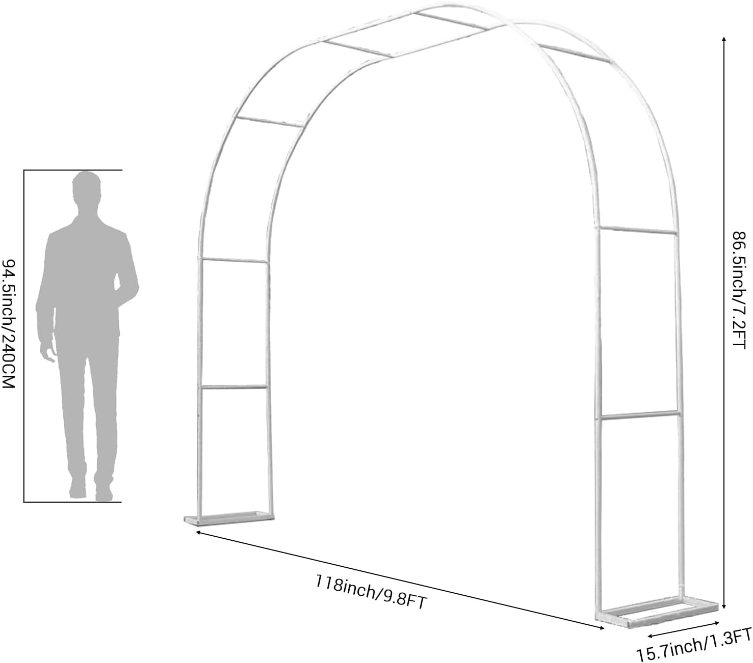 Description:Product name: Garden ArchMaterial: MetalProduct color: White, blackProduct shape: squareProduct size: 3m x 2.2mProduct weight: about 6kgFeatures: removable; Corrosion resistance; Not easily deformedApplicable scene: lawn, garden, wedding decoration, party decoration, etcSuitable for decoration: plants, dried flowers, valance, balloons, etcPacking list:Garden Arch x 1