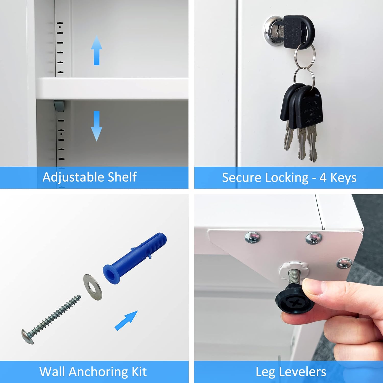 | Additional Features | Adjustable Feet, Adjustable Shelf, Lockable Doors with 4 Keys |