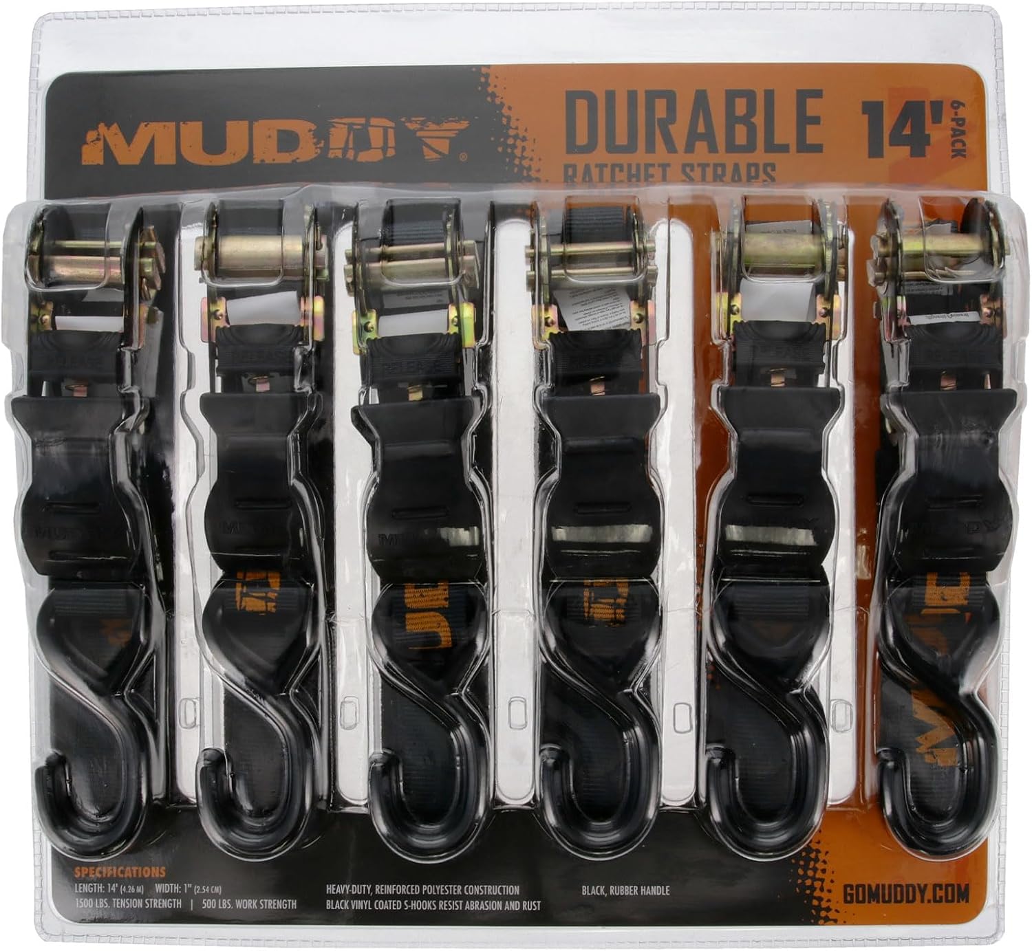 MUDDY 1" X 14' DURABLE RATCHET STRAPS: Ensure the safety of your cargo with the Muddy 1" X 14' Durable Ratchet Straps, 6 Pack. Designed to withstand the toughest challenges, these straps offer a substantial 1500lb breaking strength, providing you with the confidence that your load will remain securely fastened. With a 500lb working strength, they are engineered to handle heavy-duty tasks with ease. The coated hooks enhance grip and prevent slippage, while the durable hardware ensures long-lasting performance even in rugged conditions. Invest in Muddy Ratchet Straps for ultimate peace of mind and security during transportation. MAIN FEATURES: - 1" x 14' Durable Ratchet Straps / 6 Pack; - 500LB working strength; - 1500LB breaking strength; - Coated hooks to secure cargo; - Durable hardware. MUDDY BRAND: Muddy is a renowned brand specializing in innovative hunting and outdoor products designed to enhance the hunting experience. With a commitment to quality, durability, and functionality, Muddy offers a comprehensive range of hunting gear, including tree stands, trail cameras, ground blinds, and accessories.