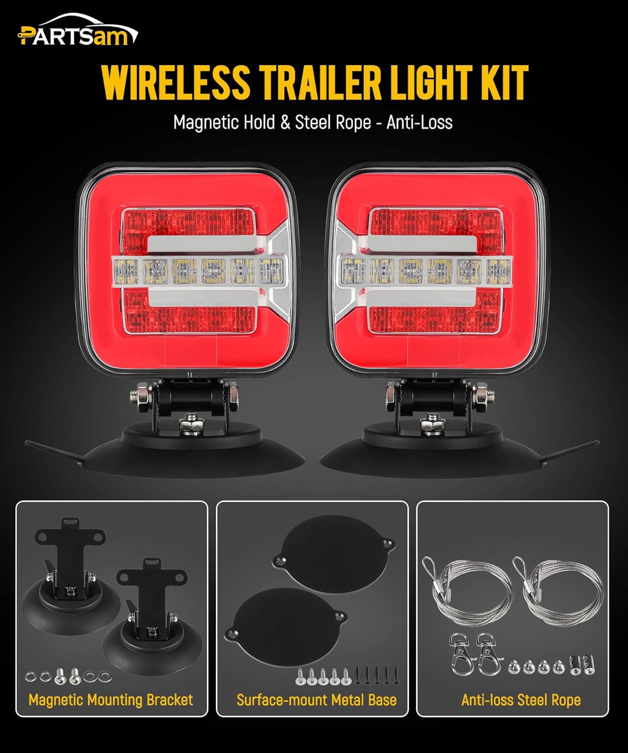 | Included Components | 2 square wireless magnetic LED trailer lights, 2 magnetic mounting brackets, 2 metal bases, 2 anti-loss steel ropes, 1 7-pin transmitter, 1 USB-type C charging cable, 1 USB cigarette plug adapter, and 1 user manual |