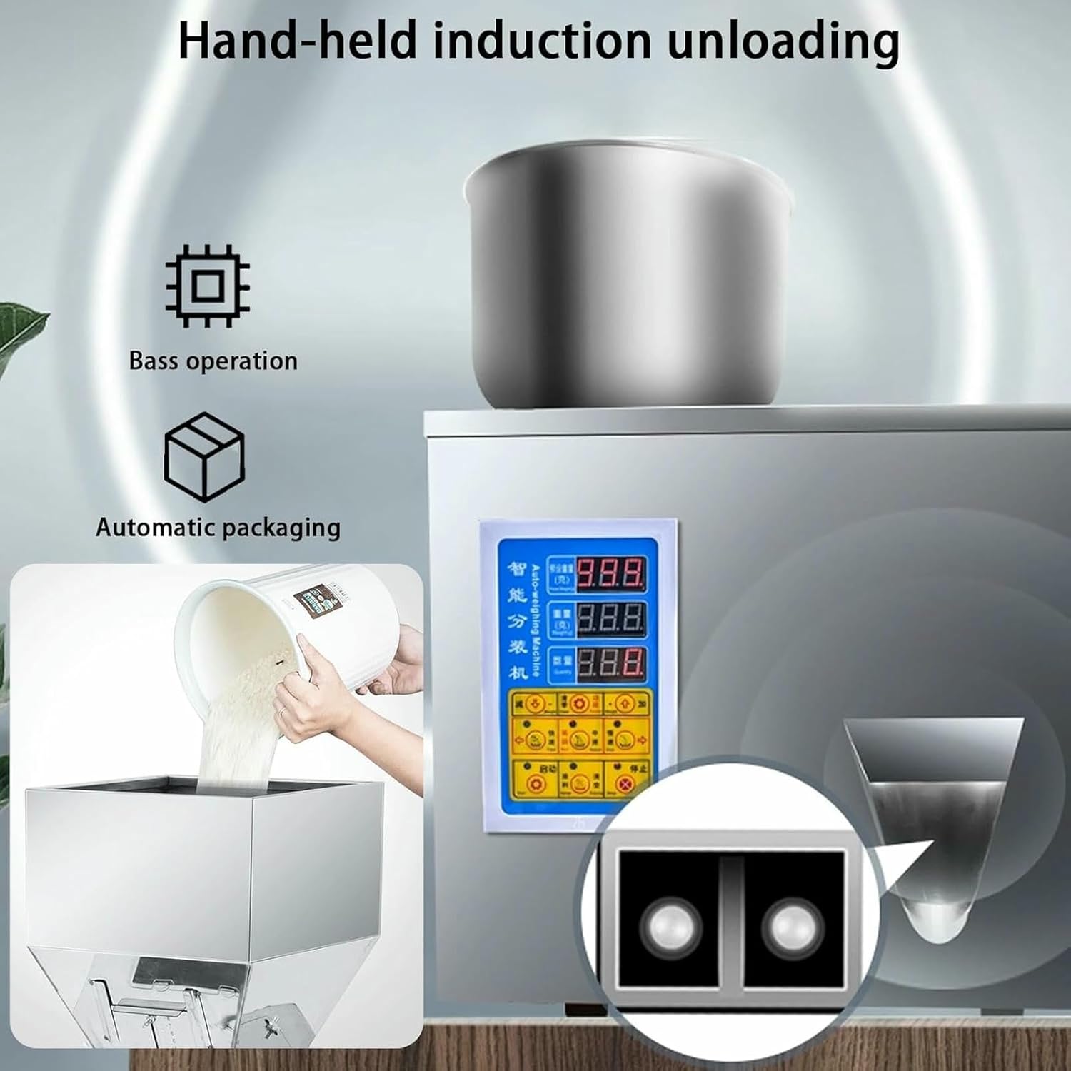This automatic filling machine has revolutionized the material sorting process,especially for those materials that require precise measurement and handling. Specifications: Product name: Intelligent filling machine Color: Silver Material: Stainless steel Specifications: 1-50g,1-100g,1-200g Process: Electric welding,polishing Function: Vibration unloading,volume weighing Power: 200w Speed: Fast,Medium,Slow Filling speed: Varies with materials Filling accuracy: Varies with materials Package included1* Powder filling machinePrecautions1. Please clean the inner channel with a soft towel or brush. If there is some material left in the inner channel,you can use a hair dryer (not included) to gently blow off the residual material.2. Please remove the red screws marked on the bottom plate of the machine before use.3. Manual measurement,please allow 1-10mm deviation.4. Due to the difference in light and screen,the color of the product may be slightly different from the picture.