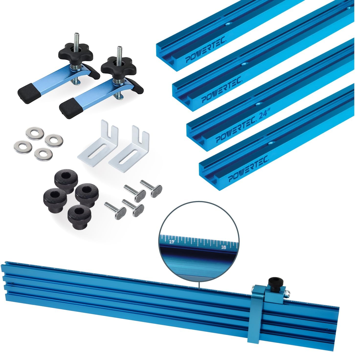 Introducing the Drill Press T-Slot Table Top Fence Kit and 3-Inch Fence Flip Stop by POWERTEC, a comprehensive solution designed to enhance your woodworking experience. Whether you're upgrading an existing t-slotted table or building a DIY drill press worktable, this premium kit provides all the components you need for high-precision adjustments and secure project hold-downs. The kit includes a versatile Multi T-Track Fence, a premium aluminum extrusion that slides smoothly to fit the needs of any project. It provides a secure interface with your table and is designed to help you customize and create your own workstations, fences, jigs, and fixtures. The 71335 Multi Track Brackets and Clamping Knob Hardware package ensures a secure setup of the fence to your t-slotted table with quick adjustments, thanks to the ¼”-20 t-bolts and clamp knobs. Also included is the 3” Fence Flip Stop, a user-friendly, pre-assembled design that enables highly effective setups in jigs and fixtures. The flip stop features a convenient flip-up, flip-down action for repeatable cuts, and its arm can be moved to the left or right side of the body for complete flexibility. The stop can also be positioned inboard or outboard depending on your setup needs, ensuring precise measurements and easy adjustments. The kit further includes two 71083 T-Track Hold-Down Clamps, featuring ergonomically designed 5-star knobs, non-marring clamping pads, and high-tension clamping capacity for excellent clamp action, ensuring your projects stay securely in place. Made from durable anodized aluminum, the 3” Fence Flip Stop is built to last and resistant to corrosion. It’s ideal for use with router tables, miter saws, drill presses, and more. The flip stop works with various t-track systems, including single, double, and multi tracks, and offers a reliable, repeatable solution for your woodworking needs. Note that this stop is designed to fit Universal or Double Cut T-Tracks (23/64” wide top slot), so please v