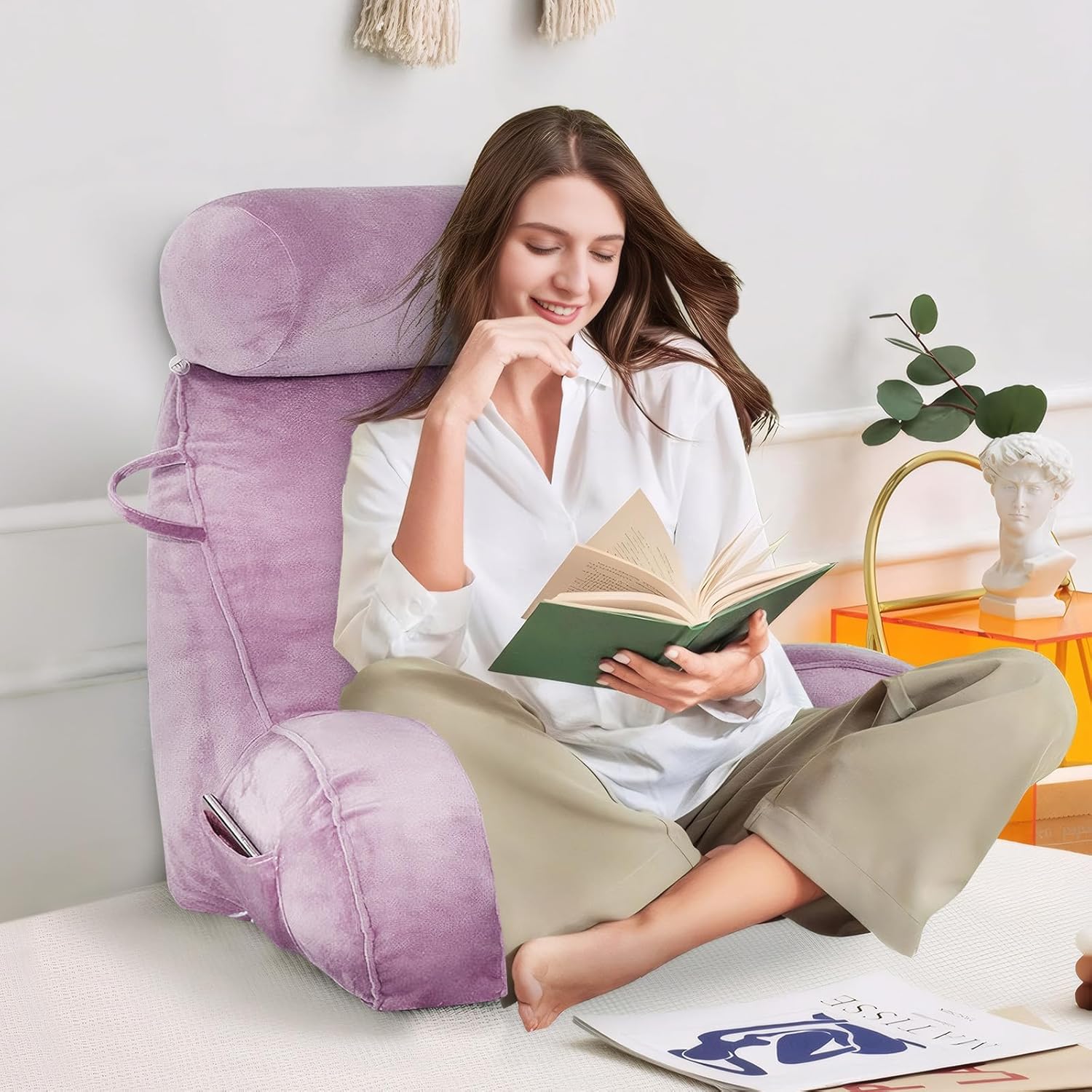 Elevate your reading experience with WTHAVEN cozy reading pillow designed for ultimate comfort in bed. Its ergonomic shape provides excellent back and neck support, allowing you to indulge in your favorite books or movies for hours without straining.The plush, soft material cradles your body, while the sturdy construction ensures long-lasting use.With convenient handles, you can easily adjust the pillow to find your perfect reading position.Measuring approximately 26 inch in height and 17 inch wide, this reading pillow fits most beds and chairs. Embrace relaxation and immerse yourself in your literary adventures with this versatile reading companion.Note: Our reading pillows are vacuum packed for compressed transportation. After receiving the product, please knead and shake the pillow vigorously for 5 minutes to let the fiber filling inside spread out. It takes about 48 hours to fully expand. Once ready, indulge in the utmost comfort of our reading pillow, and then you can enjoy the best comfort experience.
