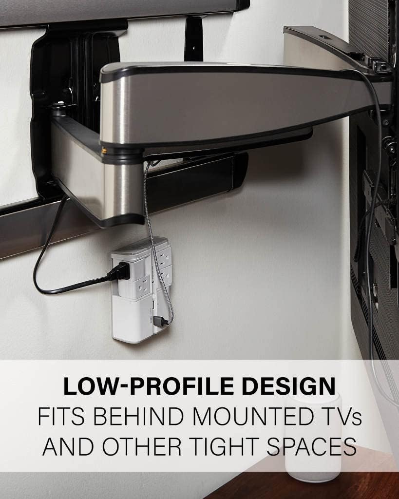 On-Wall Surge Protector with 4 rotating outlets and 2 USB Ports The On-Wall Surge Protector from Sanus features 4 rotating outlets and 2 USB ports lets you bring power to where you need it most. 4 rotating outlets allow for larger plugs without blocking other outlets. To power up smaller devices, there are two convenient USB ports. Product Features 90 degrees of rotation allow you to fit larger plugs without blocking other outlets Plugs directly into any existing outlet saving you space and cord clutter on the ground Low-profile design fits behind mounted TVs and other tight spaces Plug in, power and protect up to 6 devices at once with flexible rotating outlets and fixed USB ports 1080J rating protects your devices from electrical surge damage and is fireproof to keep your entire home safe The Details