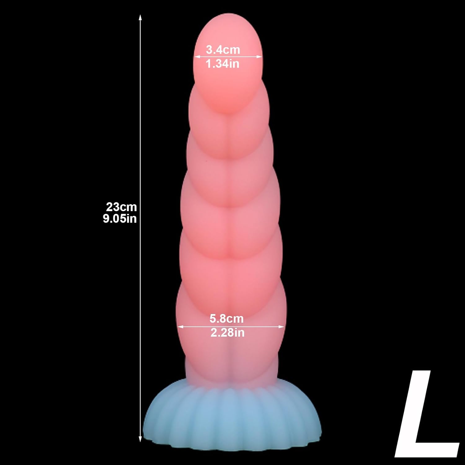 Adult Sex Toy Product Properties: Material: liquid silicone Size: S total length 14cm/5.5in, usable length about 12cm/4.72in, width is about 2-3.5cm/0.79-1.38in; M total length 18.3cm/7.2in, width is about 2.55-4.5cm/1-1.77in; L total length 23cm/9.05in, width is about 3.4-5.8cm/1.34-2.28in.