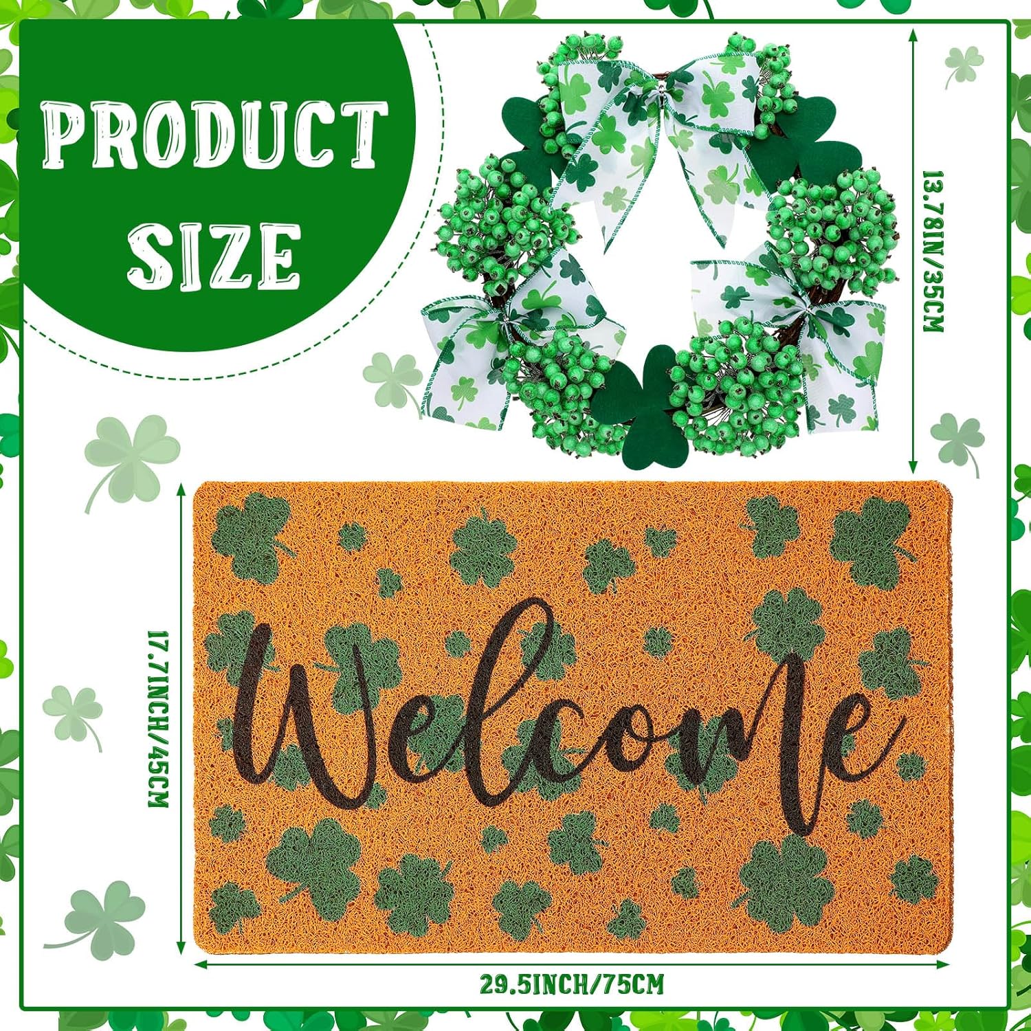 Features: Stay worry free with our non slip doormat that provides a firm grip to avoid sliding or slipping. The clover imitation coir doormat is not just functional but also adds a cheerful St. Patrick's spirit at your doorstep. The shamrock wreath with bow is easy to hang on your front door or porch but for any entryway in the dorm, office, home, hotel, restaurant, bedroom, study room and more. Specifications: Material: Doormat: polypropylene and rubber Bow on the wreath: plastic and burlap Color: mainly green and black Size: Doormat: about 17.72 x 29.53 inches/ 45 x 75 cm Wreath: about 13.78 x 13.78 x 2.36 inches/ 35 x 35 x 6 cm Package includes: 1 x Welcome imitation coir doormat 1 x Shamrock wreath with bow Notes: Manual measurement, please allow slight errors on size. The color may exist a slight difference due to different screen displays.