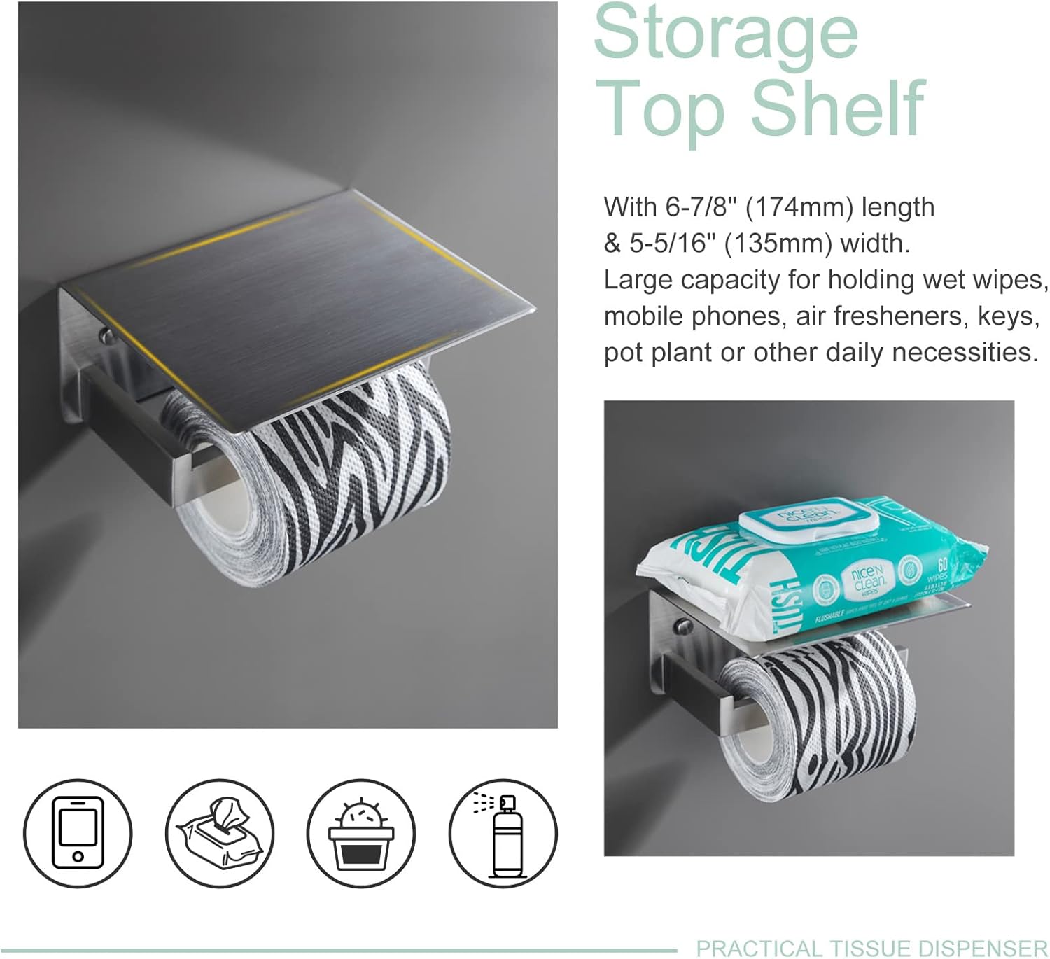 Finish: Brushed NickelMaterial: 304 Stainless SteelInstallation Method: Wall-mountedPAPER HOLDER WITH SHELFDimensions: L 6-7/8" x D 5-5/16" x H 3-3/8"(174 x 135 x 85mm)Net Weight: 1.19 lb (123g)ROBE HOOKDimensions: L 1-7/8" x D 2-1/4" x H 1-7/8"(48 x 58 x 48mm)Net Weight: 0.23 lb (105g)CARE AND MAINTENANCE1.ONLY clean with a soft, damp cloth gently.2.DO NOT USE detergents as they may harm the protective finish of your bath accessories.3.Maintenance period is 1-2 months, this care will maintain the metallic gloss finish.WARM PROMPT1.NOTE: All photography props are NOT included in the package.2.Manual measure may occurs a little dimension deviation, please in kind prevail.3.Due to light influence and display resolution, pictures and objects may have slightly color aberration.