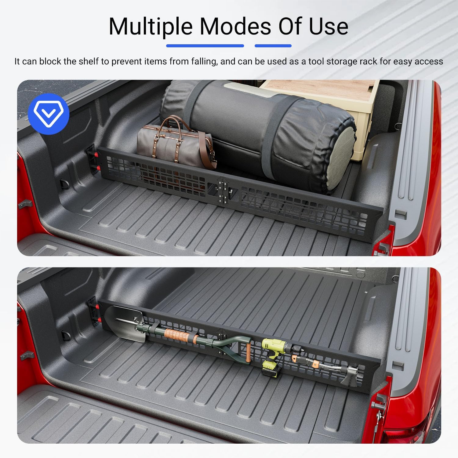 Precision Fitment: Our cargo manager compatible with 2019 2020 2021 2022 2023 2024 2025 Dodge RAM 1500 bed divider is designed according to the original model. NOTE: NOT fit truck bed with bed liner. They're NOT compatible with Quad Cab Models. Please check your vehicle model carefully before placing an order.Premium Material: Our molle panel compatible with Dodge RAM 1500 truck bed organizer is made of aluminum alloy. It is very light in weight and not prone to rust and corrosion, and could long-term use. It can also resist impact and is not prone to deformation. The hood protector is crafted from TPE material. In addition to being water-resistant, abrasion-resistant, and strong.Multi-Function: The truck bed divider replacement for RAM 1500 storage organizer can effectively optimize the spatial efficiency of the cargo area. Divide the truck bed into separate sections. Fix different items. The integrated mesh panel can also be used to fix installation tools and accessories. Our door sill guard has a raised textured surface to prevent shoe wear and debris scratches. It has non-slip grooves and a non-slip design to secure that people can get in and out safely.Easy to Install: The installation steps of cargo manager compatible with Dodge RAM bed divider can scan the QR code in the manual to watch the installation video or by checking the installation video on the product homepage. The door sill guard has double-sided tape on its back, just tear off the back of the tape and install it in the correct position.Easy to Clean: Our truck bed divider replacement for 2019 2020 2021 2022 2023 2024 2025 Dodge RAM 1500 exterior door sill protector and cargo manager are both easy to clean.