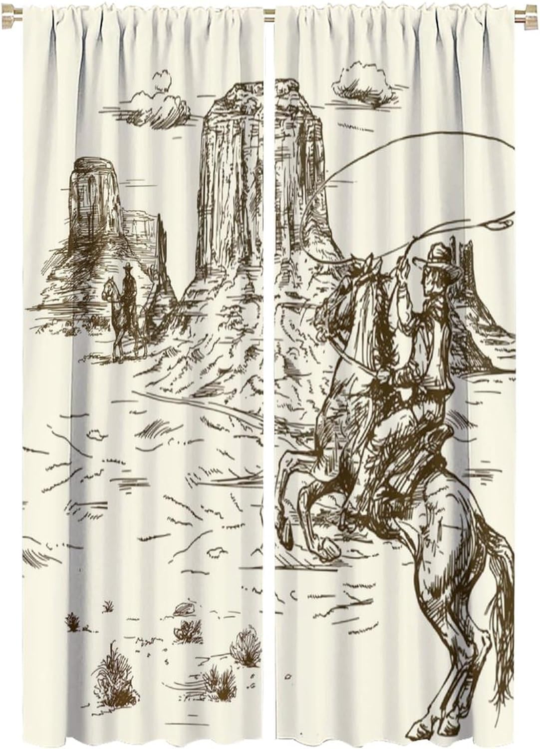 Welcome to our store. Total size: 45" L × 42" W (114cm × 107cm),Includes two pieces, each of which measures:45" length × 21" width (114cm × 53.5cm). Total size: 54" L × 42" W (137cm × 107cm),Includes two pieces, each of which measures:54" length × 21" width (68.5cm × 53.5cm). Total size: 63" L × 42" W (160cm × 107cm),Includes two pieces, each of which measures:63" length × 21" width (160cm × 53.5cm). Total size: 63" L × 55" W (160cm × 140cm),Includes two pieces, each of which measures:63" length × 27.5" width (160cm × 70cm). Total size: 63" L × 63" W (160cm × 160cm),Includes two pieces, each of which measures:63" length × 31.5" width (160cm × 80cm). Total size: 72" L × 63" W (183cm × 160cm),Includes two pieces, each of which measures:72" length × 31.5" width (183cm × 80cm). Total size: 63" L × 72" W (160cm × 183cm),Includes two pieces, each of which measures:63" length × 36" width (160cm × 91.5cm). Total size: 84" L × 84" W (214cm × 214cm),Includes two pieces, each of which measures:84" length × 42" width (214cm × 107cm). People always prefer using some decor to highlight the visual aesthetic. The brebasf Vintage Western Cowboy curtains is the beautiful choice for bedroom.Good and Healthy materialOur Abstract hand-painted Native American Wild West desert Cowboy curtain is made from a safe and durable polyester fabric ,a healthy choice for any living room.★ 95% polyester fabric.★ Easy to install. Easy to hang.★ Various style theme design, so that the bathroom is full of color and fun.Note1. Please allow a little bit of size deviation due to manual measurement.2. Due to differences in computer monitors, please allow a little bit of color difference between the picture and the object.